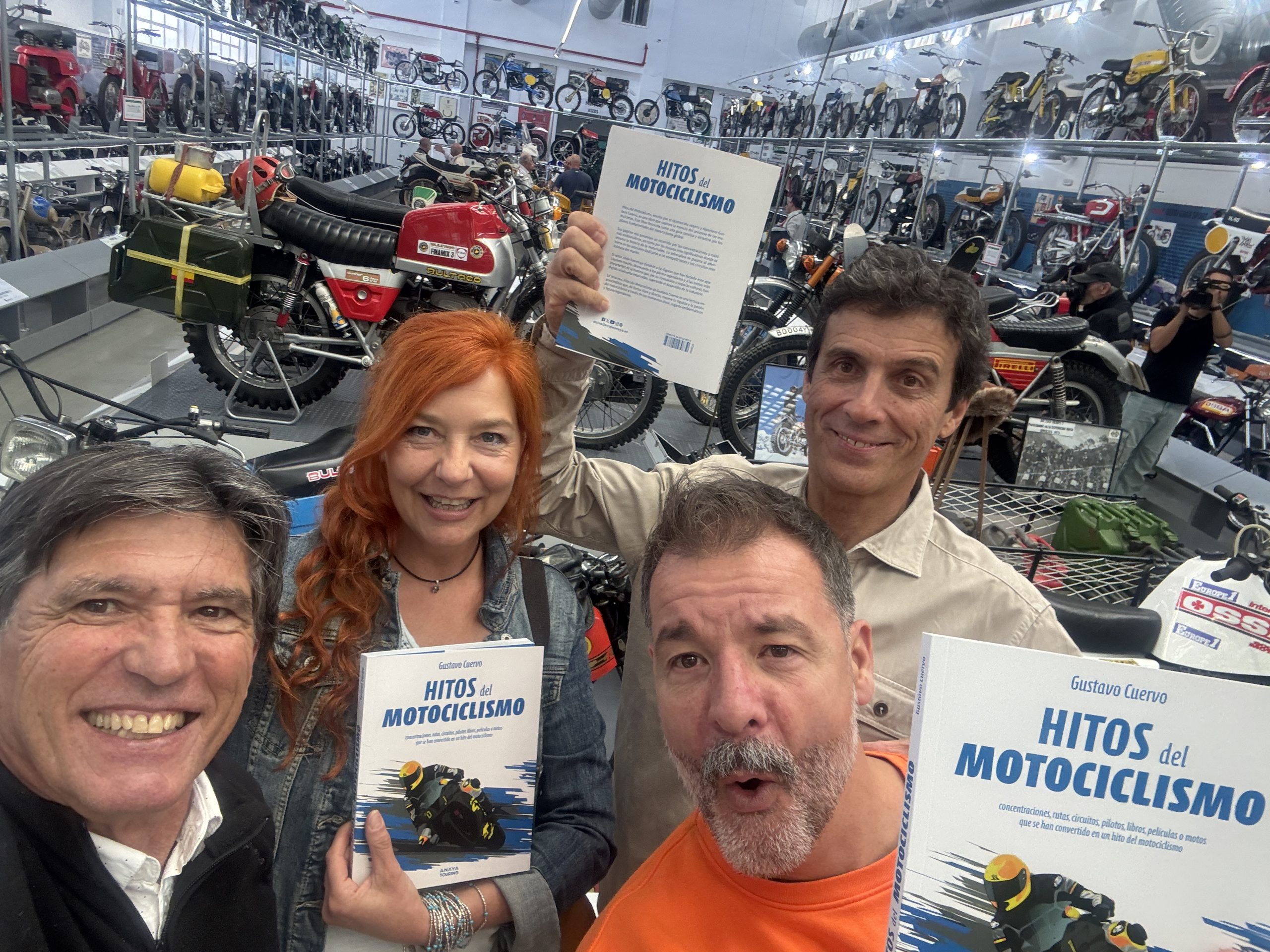 De izq. a dcha. Gustavo Cuervo ( autor ) Ana van der Sluis (motoviajera) Florian Reyes ( periodista ) Victor Gancedo ( piloto de pruebas comunicador). Museo de la Moto Made in Spain. Alcalá de Henares.