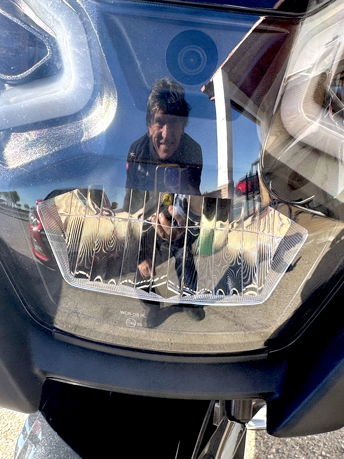 Los espejos están muy bien integrados en el frontal, por cierto de aspecto imponente con iluminacion completa de leds y muy bello diseño, Los retrovisores no permiten ver completamente en toda su superficie lo que que tienes por detrás. Hay que regularlos para ver entre los guantes en la parte superior y la maleta en la parte inferior. Los espejos también se pueden plegar ganando un poco de espacio para mover la moto en parado en lugares muy estrechos.
