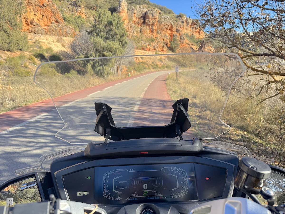 Como no podía ser de otra forma la manera de probar a fondo esta moto es viajando, durante varios días y sumando mas de 1400 km por todo tipo de carreteras, desde largos enlaces por autovía a ritmo elevado constante, por nacionales reviradas y por locales aun mas sinuosas y firme irregular. He tenido la GT-K diez días y la he utilizado como si fuera mi moto. Esto me ha dado toda la informacion necesaria para calificarla como ya te puedes imaginar como …una gran rutera.