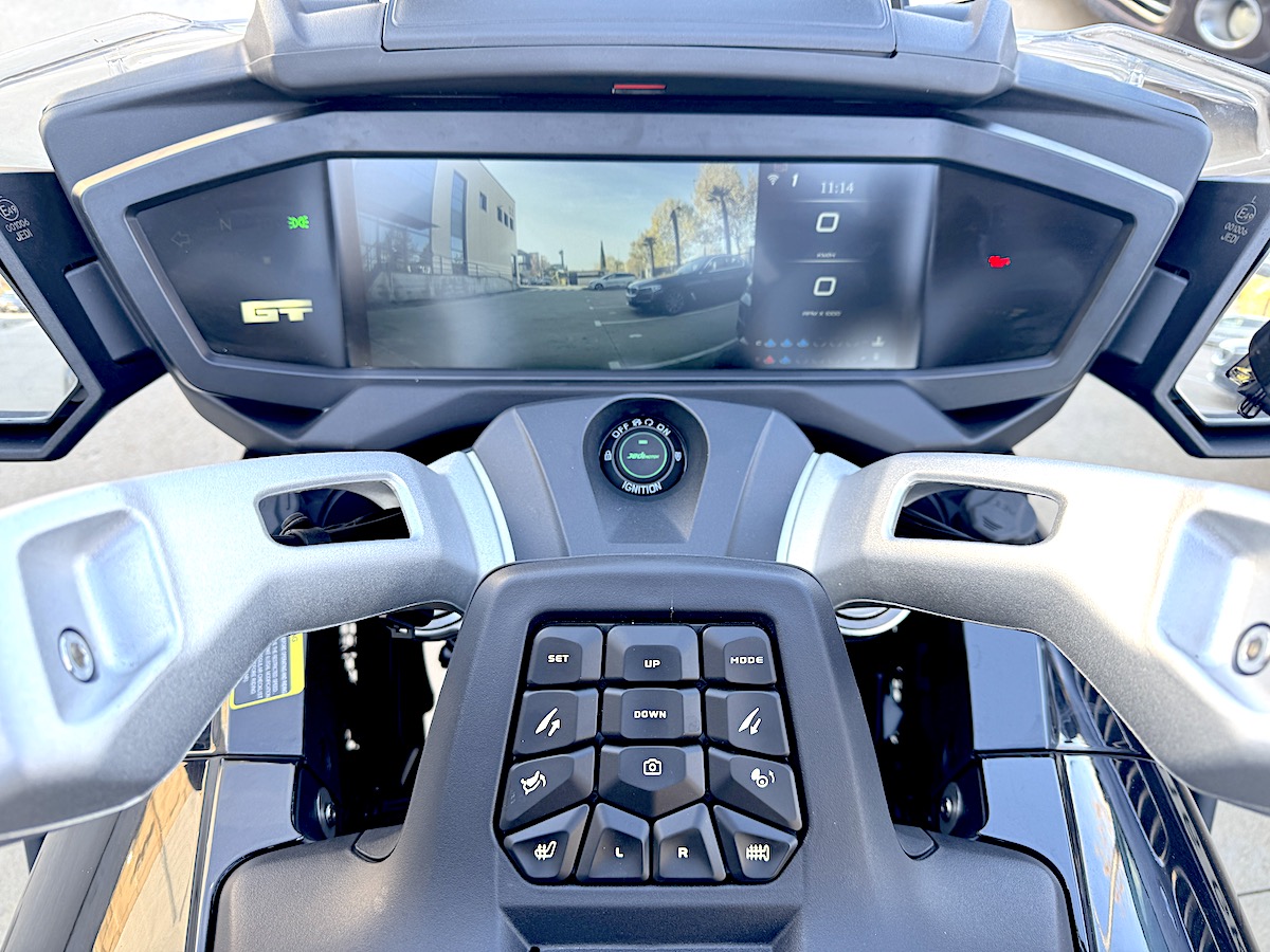 El generoso parabrisas muy envolvente es de regulación eléctrica y el puesto de conducción es impresionante con una pantalla TFT muy, muy amplia ( 12,3 pulgadas) que muestra claramente toda la informacion básica de funcionamiento necesarias. A ambos laterales donde se sitúan los testigos de control están bien integradas y parecen una prolongación de la pantalla TFT. Todos las luces de aviso aparecen aquí muy fáecilmente visibles, incluido el aviso de baja presión de neumáticos. En la botonera central se activan calefacción en puños y asiento del conductor, apertura tapón deposito, cámara de imágenes y el menú que contiene un sub-menú que permite ver otros parámetros pero eso si, esto hacerlo solo en parado. Para conectar tu dispositivo móvil con la moto hay que descargarse una aplicación gratuita denominada CARBIT RIDE aceptar los permisos de geolocalización, activar el Bluetooth desconectando los datos móviles. Un código QR y las instrucciones del libro de mantenimiento guían en la conexión. Si lo haces tendrás una magnifica y gran pantalla de navegación. Se echan de menos el testigo de temperatura exterior, autonomía restante y puestos a pedir un segundo trip, pero sobre todo que la pantalla sea anti-reflejo pues no se vé cuando incide la luz del sol o hay una pequeña patina de polvo sobre ella. Salvo estos detalles toda la informacion es muy fácil de leer debido a sus dígitos de gran tamaño y que ademas presenta una novedad tecnológíca que yo no había visto hasta ahora. Al poner el intermitente de cualquiera de los lados se activa la cámara trasera y aparece en la pantalla la imagen de lo que tienes detrás. Se ve muy bien y no se pierde la informacion básica, velocidad, marcha engranada, cuenta rpm, (solo un numero de los miles de vueltas etc ) nivel de combustible que se mantiene en le cuarto derecho. Y ¿sabes que pasa? que cuando te acostumbras, al ir a girar pones el intermitente miras por los espejos y después miras la pantalla. Una medida de seguridad que echaré de menos en otras motos. La cámara delantera también puede grabar tu ruta tanto video como fotos.