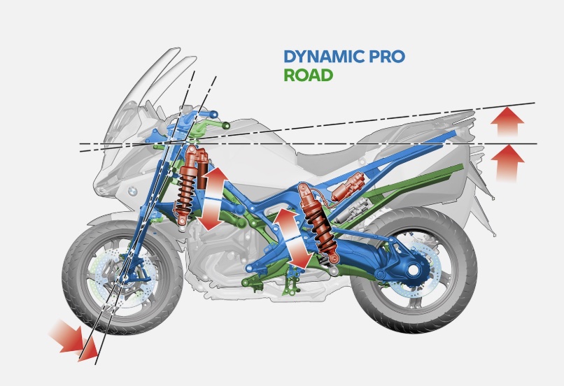 ¿Te imaginas que puedas cambiar de chasis apretando un botón? y aun mejor ¿sin tocar nada ? Pues en BMW han inventado un sistema que proporciona regulación variable de la rigidez en combinación con los modos de amortiguación. Dos modos de amortiguación delantera y trasera de ajuste individual y dos posiciones de conducción diferentes se combinan para conseguir tener dos motos en una. Cuando tu conducción es tranquila y buscas máxima comodidad en los modos Road, Eco ( todos excepto Dynamic y Dynamic Pro ) el ajuste de los muelles y amortiguadores es blando. Ideal para carreteras bacheadas o de firme irregular. Cuando cambias a los modos Dynamic la altura se eleva endureciendo las suspensiones, lo que se traduce en que puedes inclinar mas la moto sin rozar. El amortiguador trasero se alarga al máximo inclinando la moto hacia adelante «amorrandola más» lo que permite una conducción mas deportiva. También se puede ajustar a tus preferencias con ajuste mediante clic. Un nuevo salto cualitativo que se nota y se anota como excelente en la libreta del inspector.